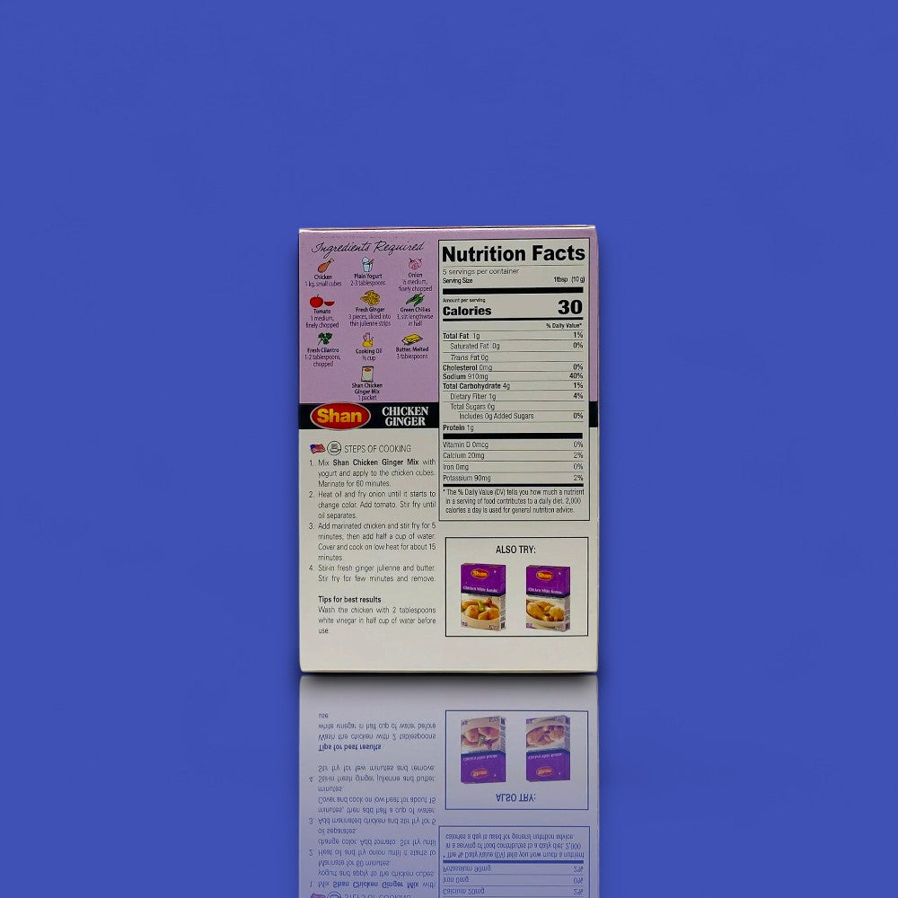 Shan Chicken Ginger Mix (50 g) brings the zesty, aromatic flavor of restaurant-style chicken ginger curry to your kitchen. Blended with ginger, garlic, cumin, and crushed red chili, this mix helps you create a rich, flavorful gravy with tender chicken and a refreshing kick of spice bold, tangy, and perfectly balanced.